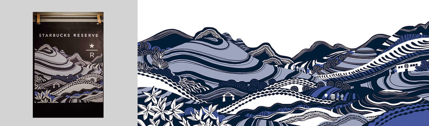 An artwork series made for Starbucks. The drawings show the mountains and layered rice terraces of Yunnan, where coffee farmers and agronomists work together at the farms. The series has six color themes, each showing a different stage of the coffee tree’s life—from flowers and fruits to harvesting, drying, and sending the beans to the city. These artworks have been used in several Starbucks stores.